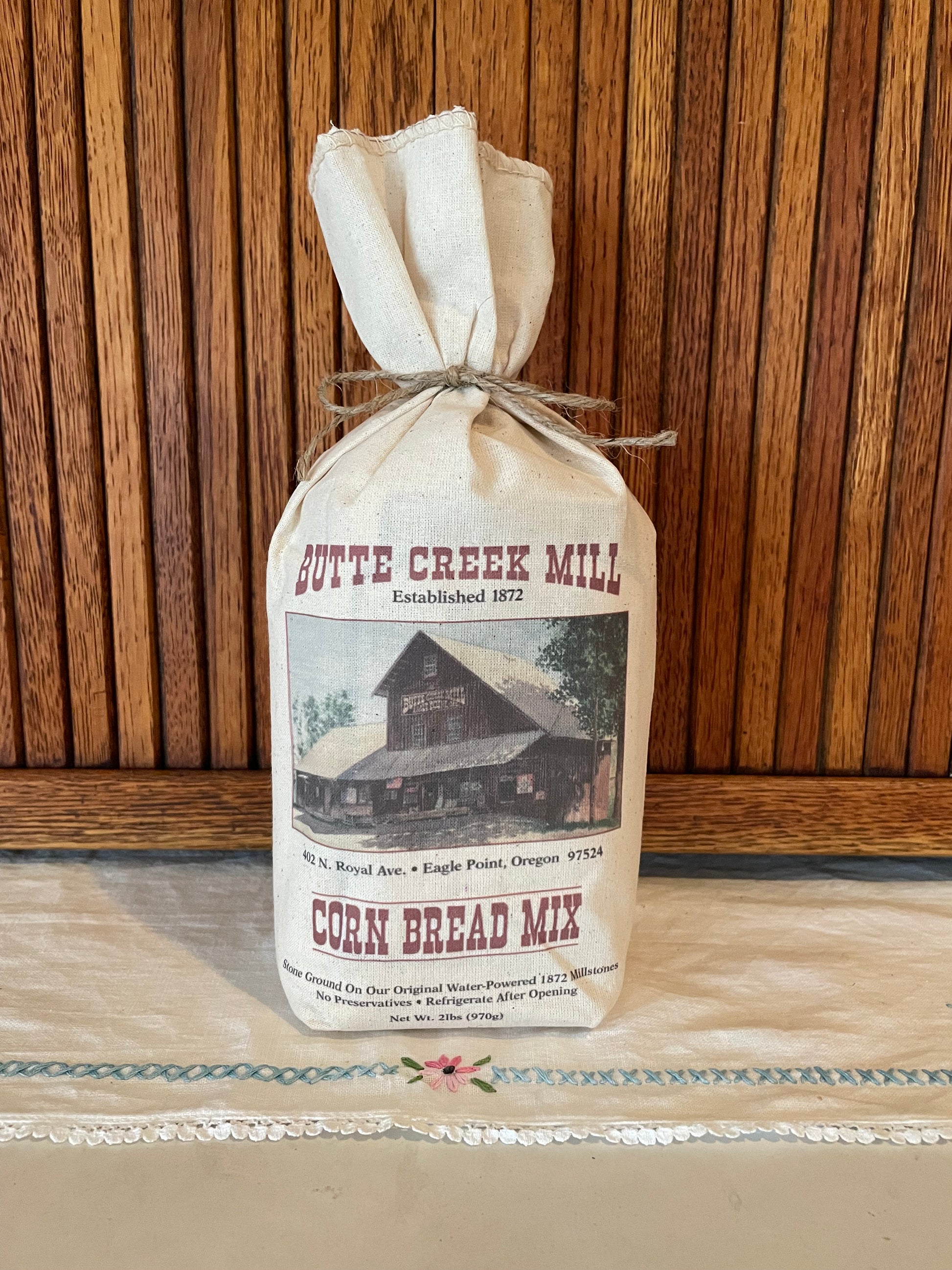 Pair this Cornbread with butter, honey, or fresh jam and you will be in for a treat! The commemorative bag, perfect for a gift, contains a 29 oz. bag of original recipe Butte Creek Mill Cornbread Mix with recipes on the back for two kinds of cornbread - one with sugar and one without. All proceeds go toward the rebuilding of the Butte Creek Mill.