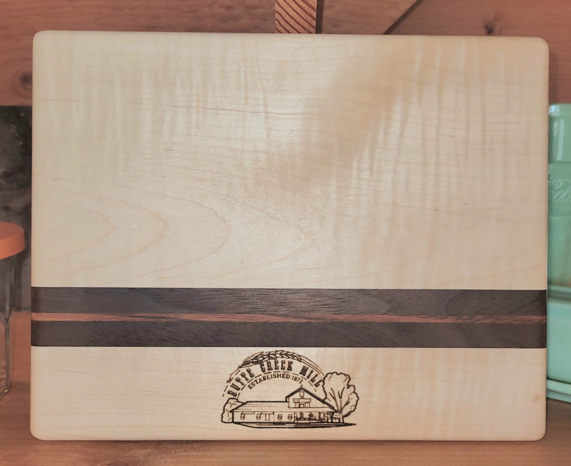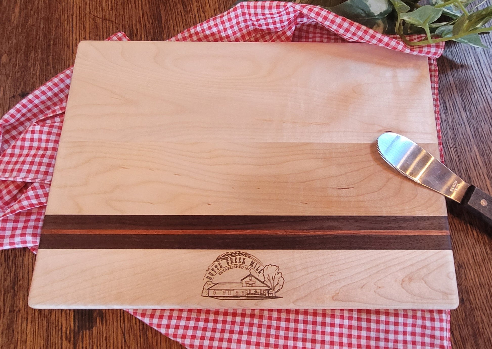 Maple cutting board with cherry wood accent and engraved with the Butte Creek Mill. These are hand crafted by local artisan right here in Eagle Point, Oregon.