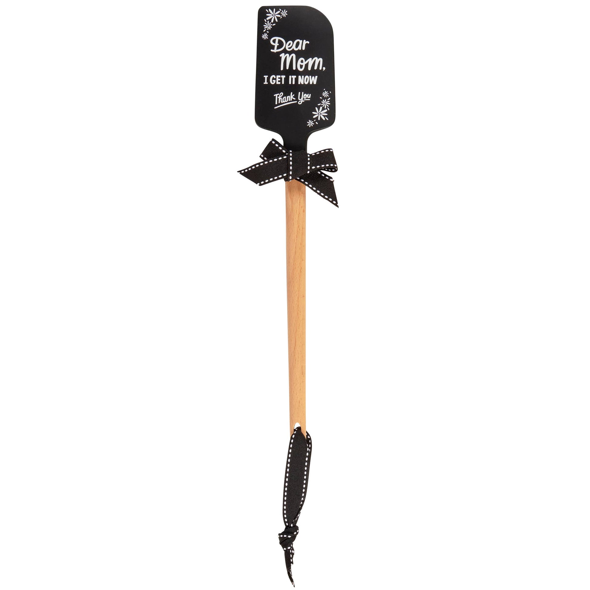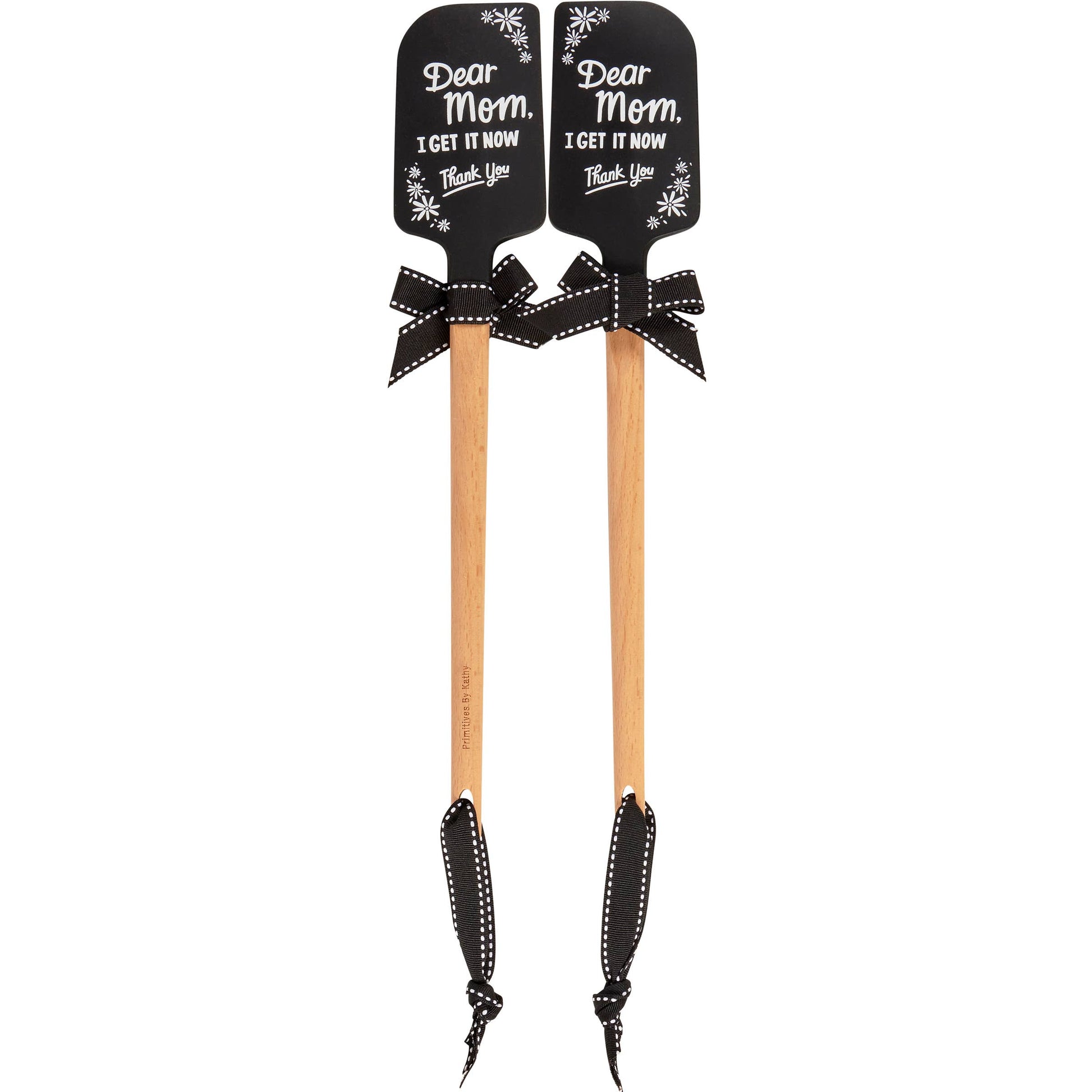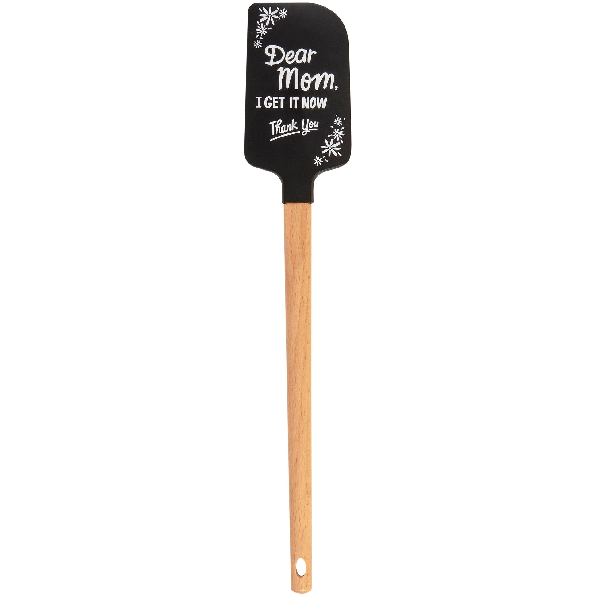 A double-sided silicone spatula from our LOL-Made You Smile Collection displaying hand illustrated black and white designs on both sides. Design features a fun mom-themed sentiment that reads "Dear Mom, I Get It Now - Thank You" accented with flowers. Logo is engraved into wooden handle for added interest. Our Dear Mom spatula includes a complementing decorative bow and hole at the bottom for hanging. Hand-wash recommended; not microwave safe. A fun mom-themed kitchen accessory perfect for everyday use.