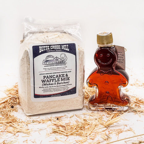 The Mill's Holiday Pancake Gift Box will include the Butte Creek Mills Heritage Pancake/Waffle mix, a family favorite for over 65 years, and the season's favorite pure maple syrup in a classic glass gingerbread man.