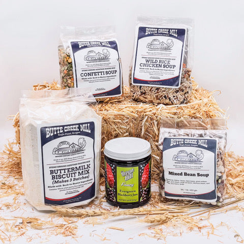 **Soups On** Comfort food truly is the best food! This gift box makes a perfect present for any occasion throughout the year. Enjoy our Confetti, mixed bean, and wild rice soups, featuring the famous soup mixes from Butte Creek Mill. No warm soup is complete without our old-fashioned buttermilk biscuits, reminiscent of the good old days. And to top it off, indulge in Oregon Hill's farm-grown Evergreen Blackberry Jam. If you haven’t tried Evergreen Blackberry jam yet, you’re in for a delightful treat!