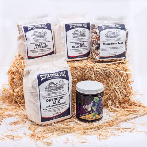 **Sweet and Savory Gift Box** The Sweet and Savory Gift Box is a delightful mix, perfect for those afternoons and evenings by the fire. It includes mixed bean soup, the Mills' famous beer bread mix, our Heritage scone mix, and Oregon Hill's Seedless Marionberry Jam, a delight to your senses. To top it all off, enjoy the Old Fashioned Carrot Cake Heritage mix.
