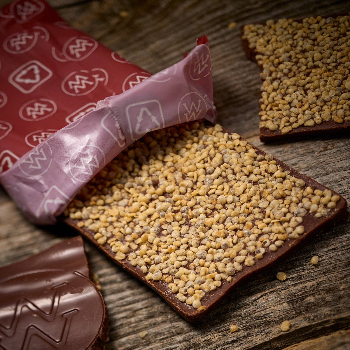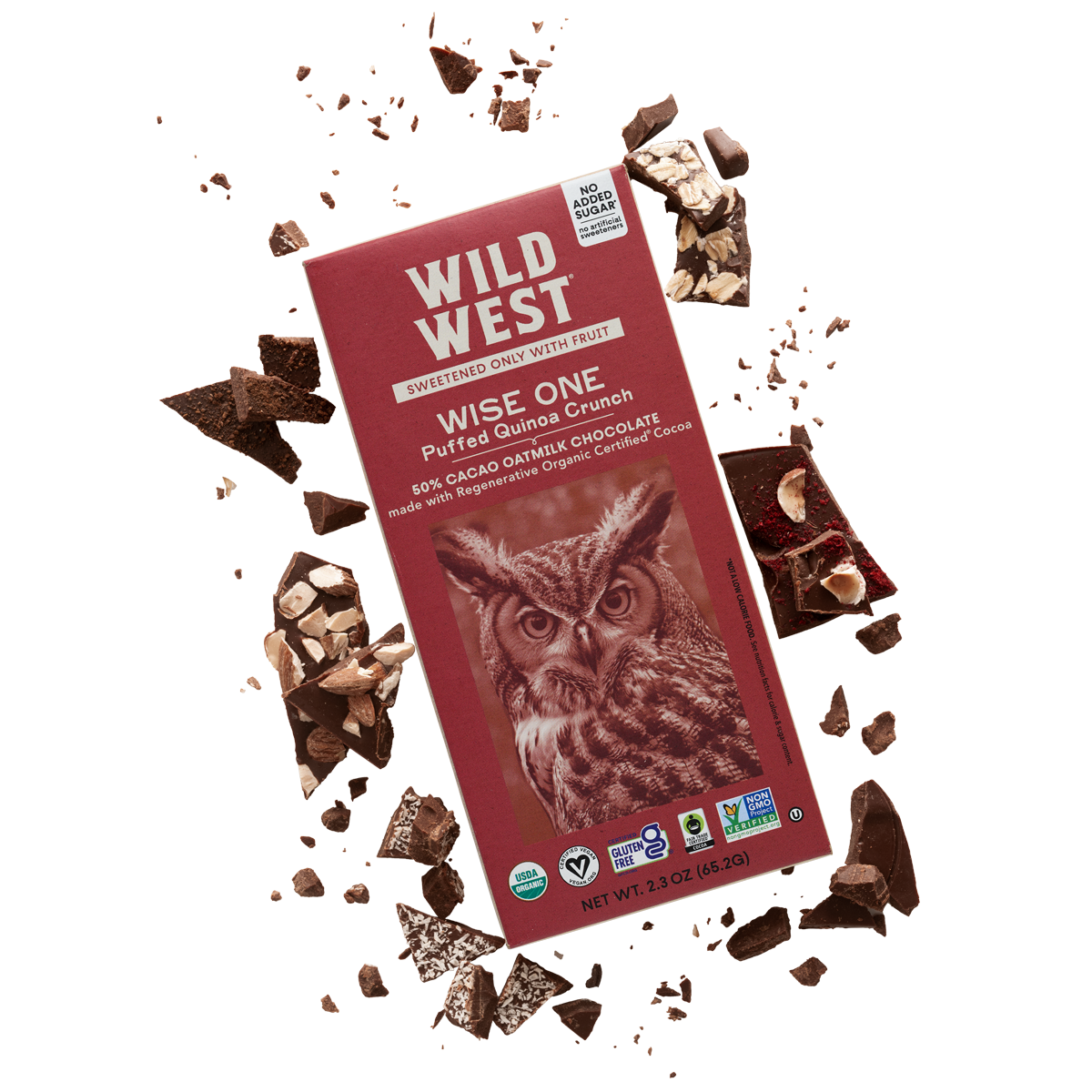 Sweetened Only with Fruit Wild with wisdom, this is Wise One. Cultivated by our ancestors for centuries, puffed quinoa adds a gentle nutty flavor that soars with snap, crackle & pop in our creamy, oatmilk chocolate. An ancient and sacred seed, quinoa is packed with essential vitamins, minerals and antioxidants. It will make your head spin…maybe all the way around!